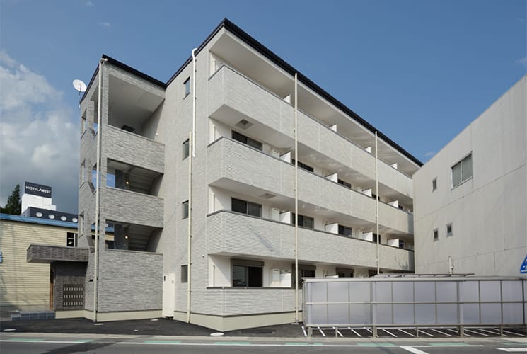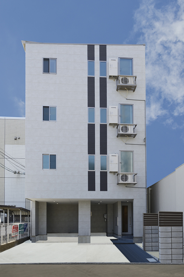 西日置に4階建てワンルーム竣工しました。 窓が多く配置してあり、室内はとても明るい空間になっております。 オートロックも配備して、防犯性を高めています。 外壁の2色の色合いもやわらかく、良い感じに仕上がっています。